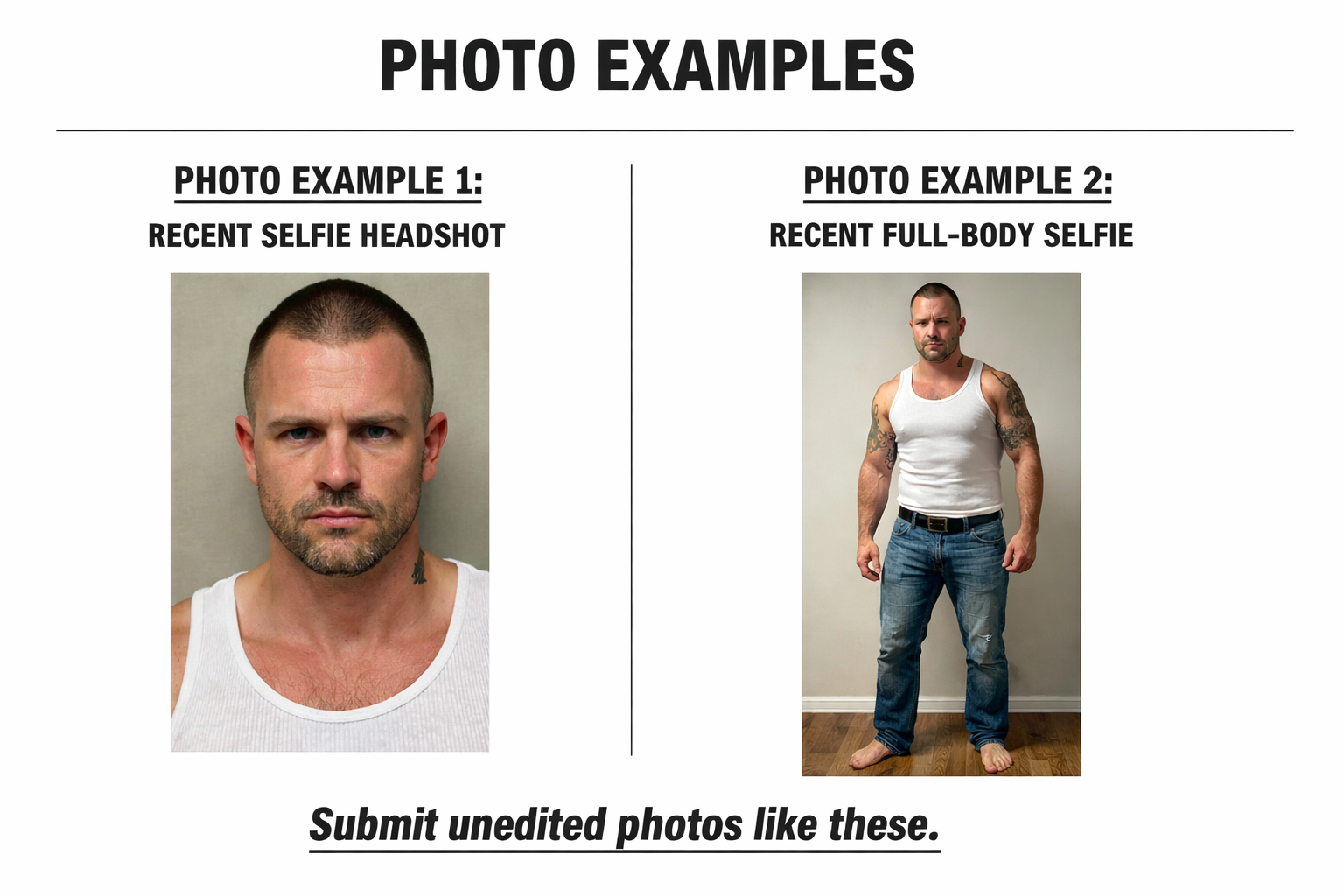 - Recent Full-Body Selfie (facing camera, head to toe)