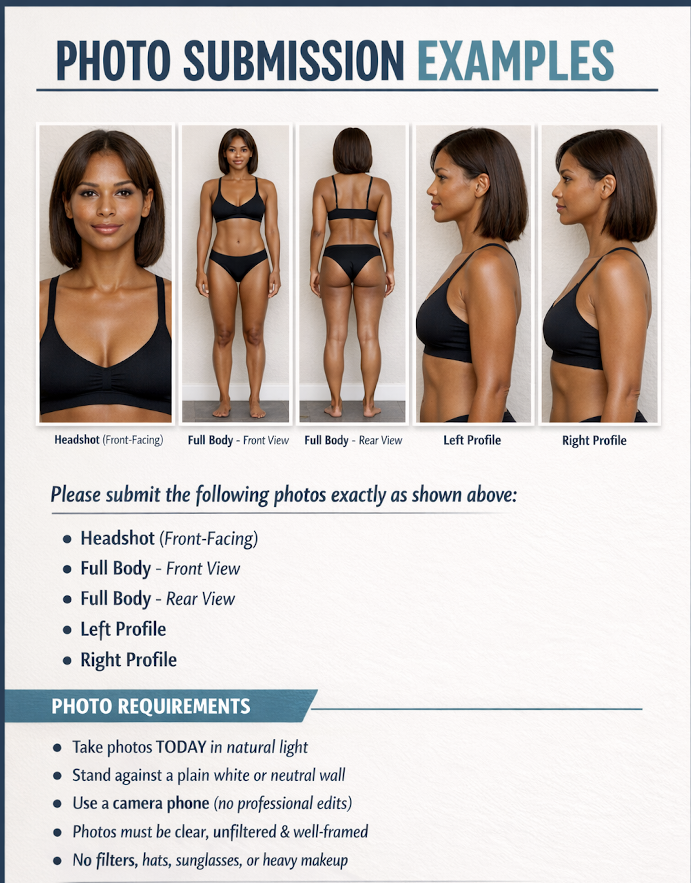 - Midsection/torso must be fully visible in all full-body photos.